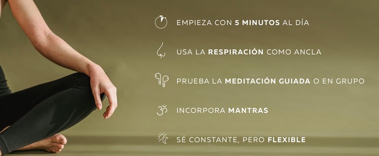 Sé constante, pero flexible: Hay días en que meditar es más difícil, especialmente cuando hay mucho estrés. Es importante no frustrarse, ya que no todos los días serán iguales: algunos días podrás meditar por más tiempo, otros menos. Lo fundamental es mantener un espacio en tu rutina para hacer algunos ejercicios que poco a poco fortalezcan tu práctica. En esos momentos, al menos hago algunas respiraciones profundas para empezar el día o antes de dormir.